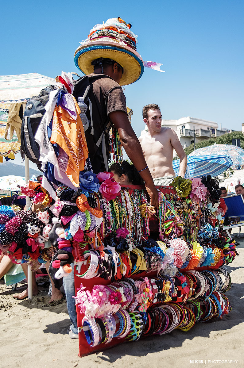 pārbauda jūsu pacietību, jo viņi savus saulesbriļļu stendus mēdz pielikt 10 cm attālumā no jūsu galvas un jūsu acis atduras pret viņu netīrajām pēdām. - Ja neko no viņiem negribiet, jo viņi jums garām staigās viens pēc otra, vienkārši nereaģējiet, vai pasakiet “NO, GRAZIE!” Ja paņemsiet rokās kādu no viņu mantām vai uzmetīsiet kādai no tām kāru aci, ziniet, ka esat viņu “gūstā”.