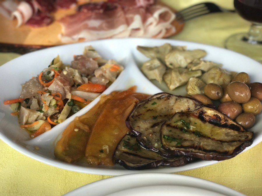 Grilēts baklažāns, paprika, veigli marinēti artišoki, olīvas